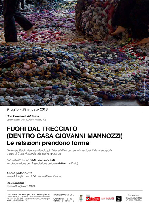 Le artiste Emanuela Baldi, Manuela Mancioppi, Tatiana Villani, invitate circa un anno fa a ideare un progetto declinato alla disponibilità e alla condivisione – da Pamela, Rachel e Dominique dell’associazione Artforms di Prato – decisero di recuperare una quantità assai consistente di tessuti industriali, in prevalenza scarti di lavorazione o rimanenze, così da assemblarli in un’installazione scultorea espansa che dall’interno dello spazio di archeologia industriale Interno8, “invadendo” suolo e pareti, si protendesse anche verso l’esterno: così l’inizio di Fuori dal Trecciato. Tramite modi vari di comunicazione, dal lasciare indizi minimi nelle vie della città al comune passaparola, vennero coinvolte numerose persone nella realizzazione concreta del progetto, in un contesto di reciproca conoscenza e di scambio. Secondo la stessa intenzione dialogica fu proposto ad un’altra artista, Valentina Lapolla, di contribuire con una documentazione/interpretazione delle varie fasi di sviluppo del trecciato.