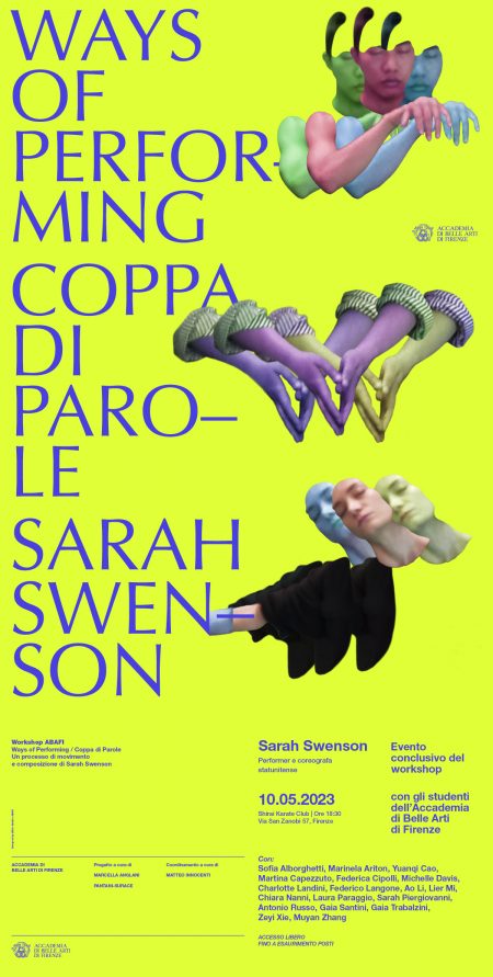 Ways of Performing / Coppa di Parole, è un workshop tenuto dalla performer e coreografa Sarah Swenson, offerto agli studenti dell’Accademia di Belle Arti di Firenze interessati all’indagine del corpo e della performatività in relazione alle arti visive.