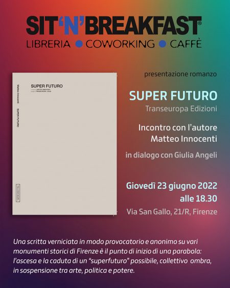 12 Dicembre 2022Casa degli Artisti, MilanoPresentazione “Super Futuro”, Matteo Innocenti in dialogo con Ermanno Cristini. Una scritta verniciata in modo provocatorio e anonimo su vari monumenti storici di Firenze è il punto di inizio di una parabola: l’ascesa e la caduta di un “superfuturo” possibile, collettivo ombra avviato da Alessandro, artista di media carriera al