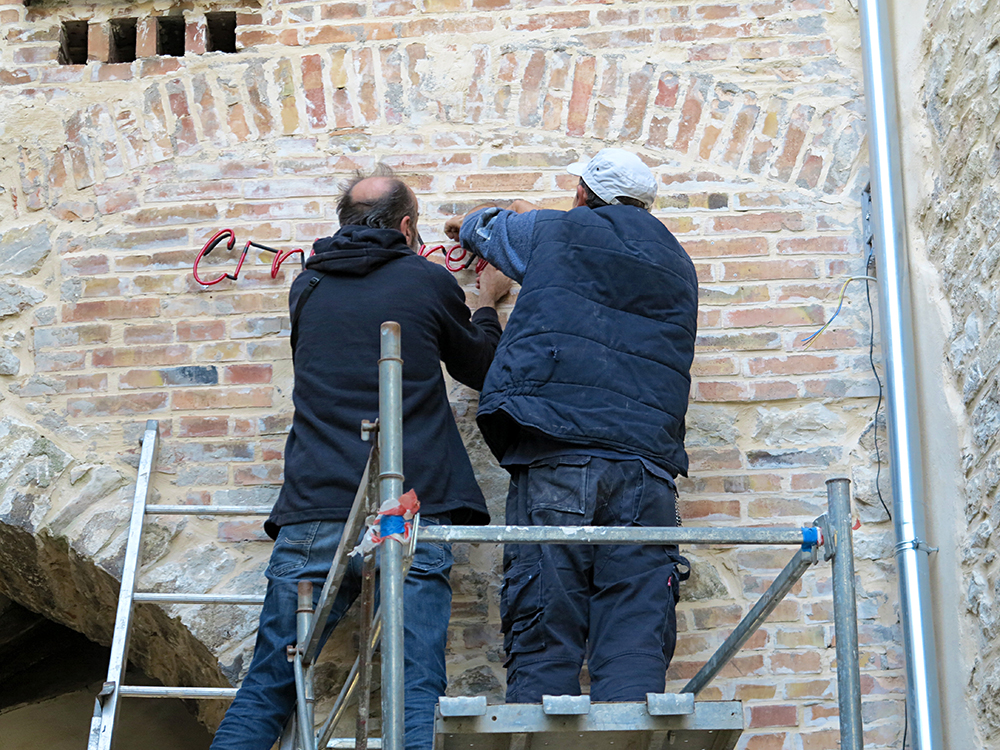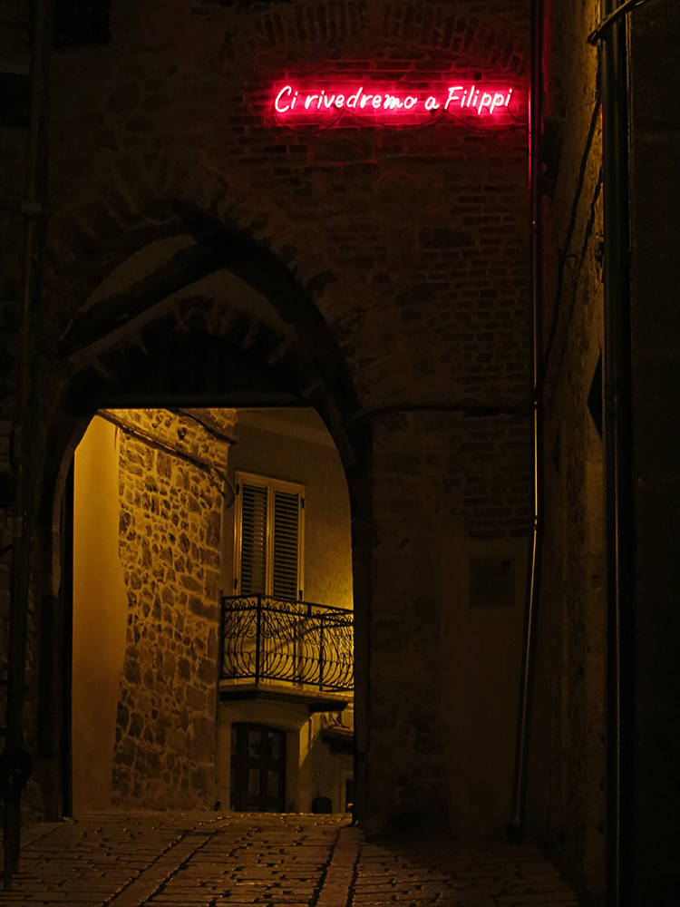 Paolo Borrelli e Fausto Colavecchia si “appropriano” della citazione, omaggiando al contempo il pittore lucitese, per proporne, a livello formale, una differente versione: un’insegna luminosa al neon installata presso la porta d’ingresso al centro storico del paese, in prossimità del palazzo marchesale; un’apparizione che riverberando accoglie le persone in arrivo e accompagna quelle che escono. La scritta, di un rosso intenso, si mostra all’inizio come un elemento differente rispetto al contesto, sia per la componente formale che per quanto esprime, ma l’effetto straniante è breve, velocemente la sua presenza viene compresa da chi la osserva secondo una propria, possibile, interpretazione. La frase adesso è lì, per delle ragioni, e ci sta dicendo qualcosa.