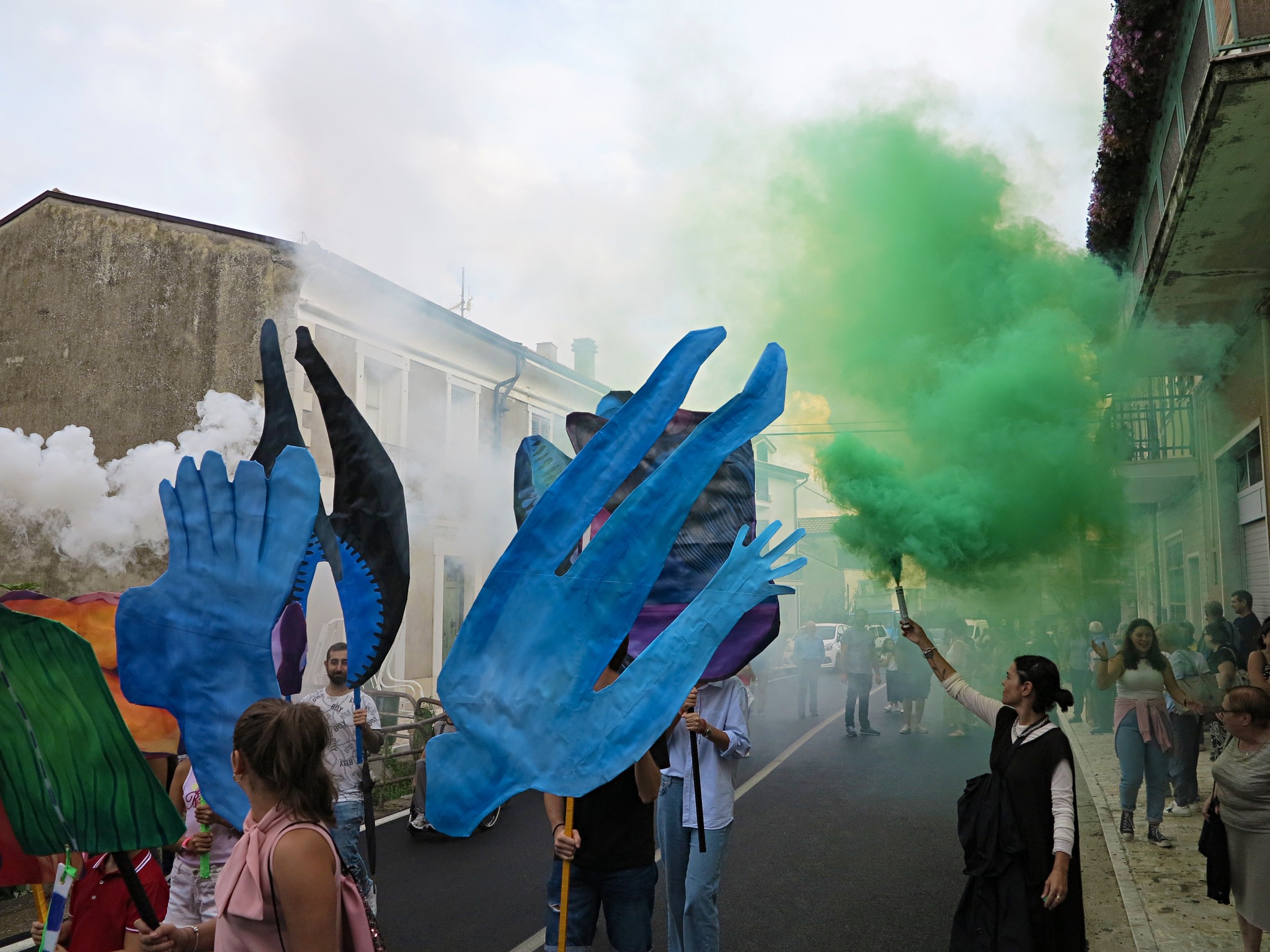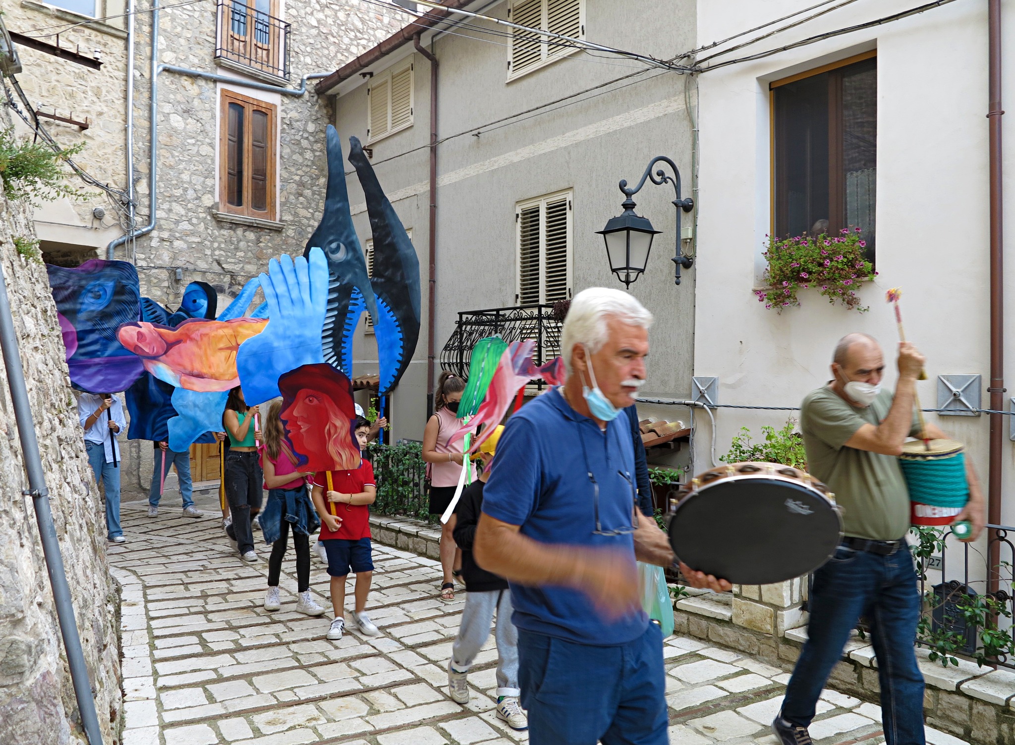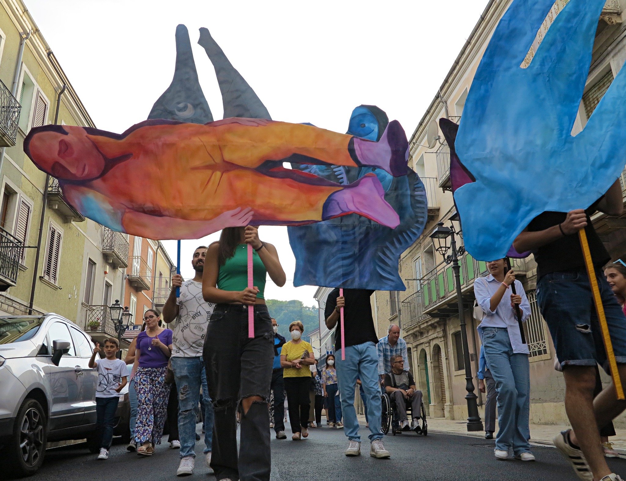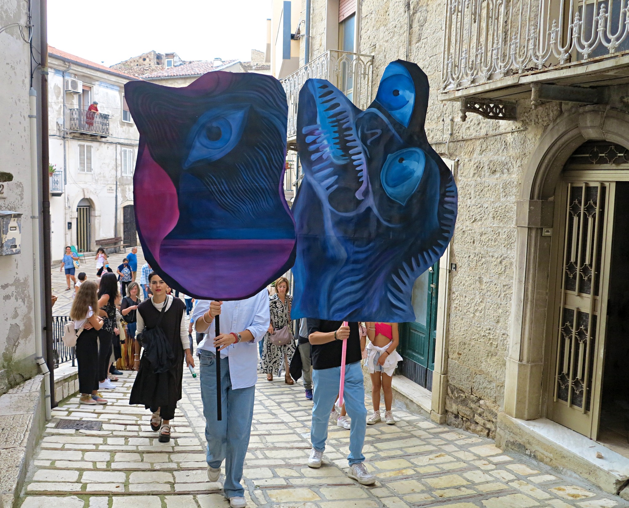 Il progetto di Anna Capolupo è conseguente all’invito a relazionarsi con la ricerca di Antonio Pettinicchi, e alla Pinacoteca comunale, a lui intitolata, che raccoglie un corpus significativo di pitture e incisioni realizzate nel corso dei decenni. A partire da alcuni elementi figurativi presenti nelle opere del pittore lucitese, in modo particolare da dettagli che ne caratterizzano in maniera netta e spesso drammatica lo stile – silhouette umane difficilmente distinguibili, organi interni, elementi medicali, occhi, volti nascosti o dalle fattezze mostruose – Anna Capolupo, proseguendo una ricerca pittorica di forte originalità, ha realizzato dei dipinti a olio su carta, di dimensioni varie, che possono essere portati come delle maschere. Il giorno della presentazione, gli abitanti del paese saranno protagonisti di una “parata” che procederà dalla casa natale di Pettinicchi fino alla Pinacoteca. Fesct! in dialetto locale significa festa; le maschere, i colori, le persone, la partecipazione: le forme conturbanti dell’artista molisano, testimonianza di una vicenda biografica dolorosa e al contempo di un grande vigore creativo, vengono reinterpretate al presente e rese nuovamente generative, in un processo di trasfigurazione che pone in luce la forza della pittura stessa.