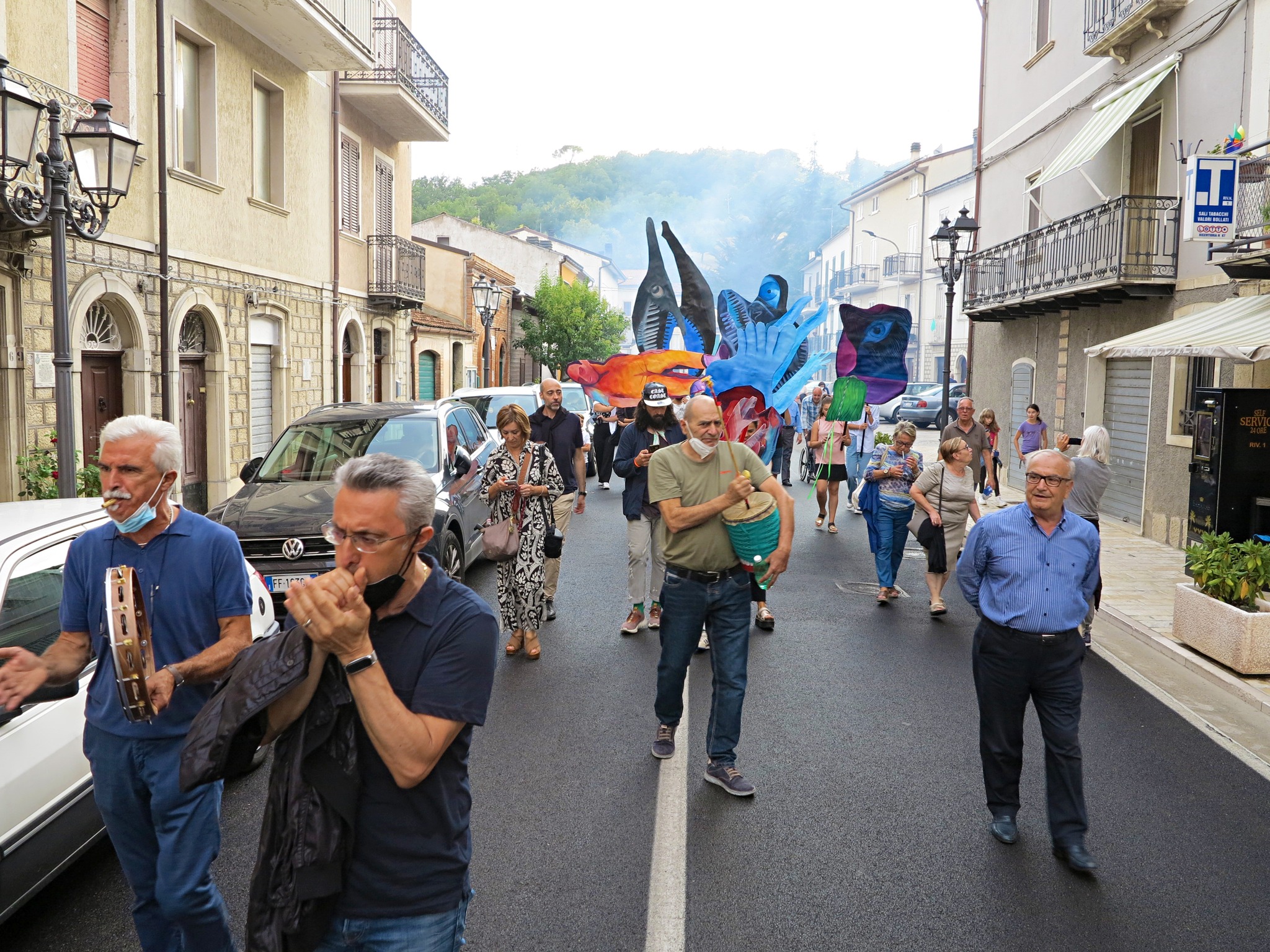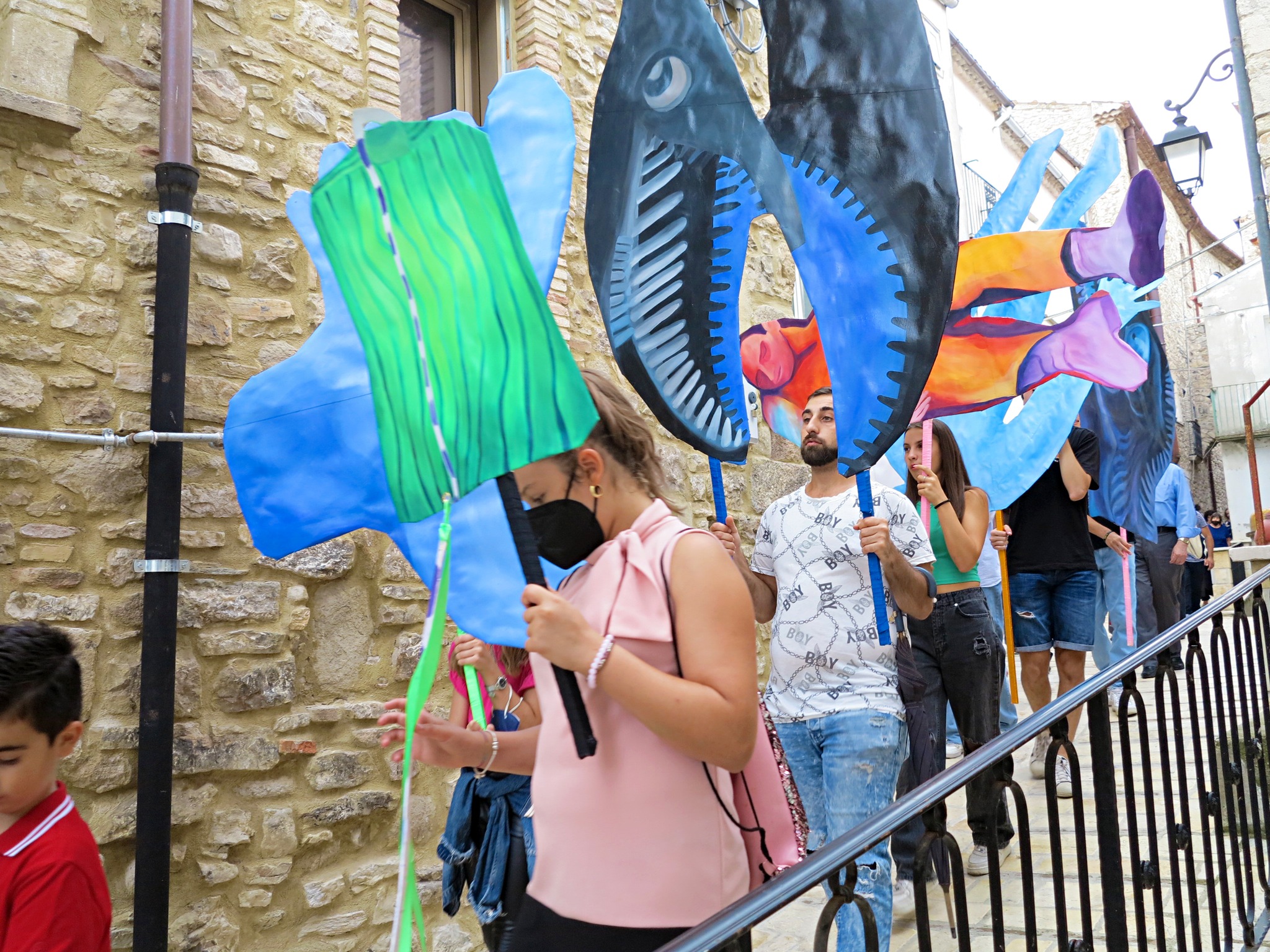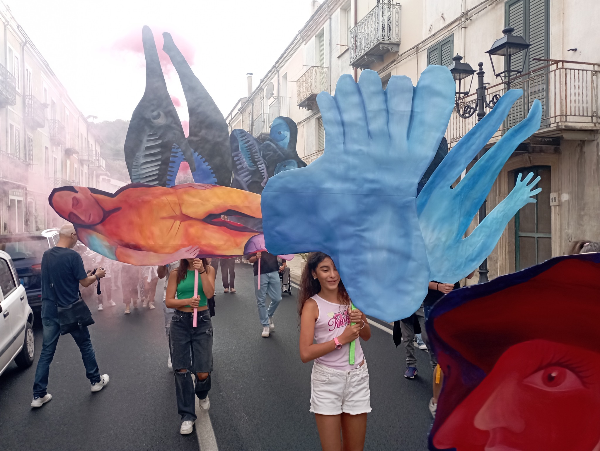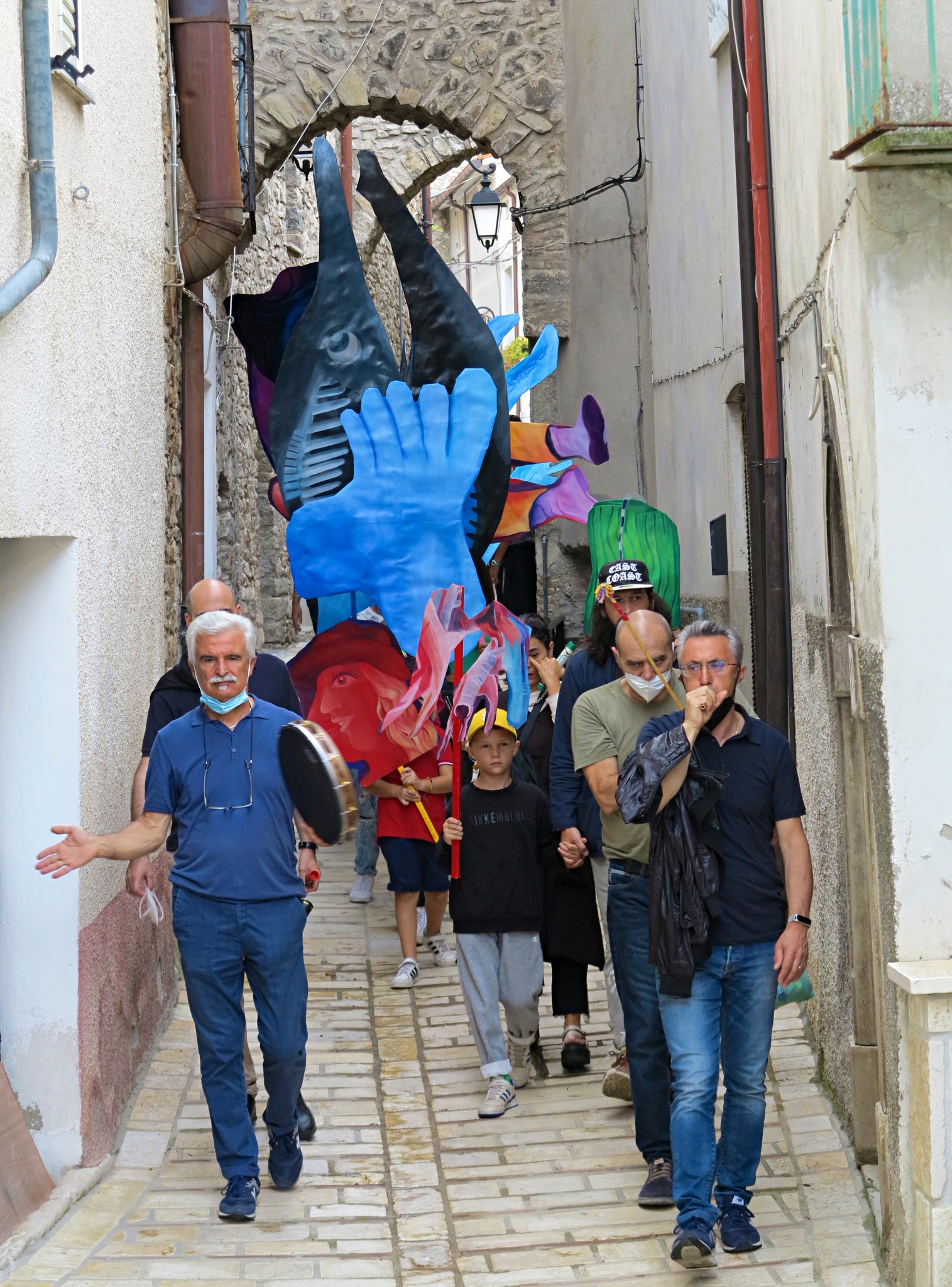 Il progetto di Anna Capolupo è conseguente all’invito a relazionarsi con la ricerca di Antonio Pettinicchi, e alla Pinacoteca comunale, a lui intitolata, che raccoglie un corpus significativo di pitture e incisioni realizzate nel corso dei decenni. A partire da alcuni elementi figurativi presenti nelle opere del pittore lucitese, in modo particolare da dettagli che ne caratterizzano in maniera netta e spesso drammatica lo stile – silhouette umane difficilmente distinguibili, organi interni, elementi medicali, occhi, volti nascosti o dalle fattezze mostruose – Anna Capolupo, proseguendo una ricerca pittorica di forte originalità, ha realizzato dei dipinti a olio su carta, di dimensioni varie, che possono essere portati come delle maschere. Il giorno della presentazione, gli abitanti del paese saranno protagonisti di una “parata” che procederà dalla casa natale di Pettinicchi fino alla Pinacoteca. Fesct! in dialetto locale significa festa; le maschere, i colori, le persone, la partecipazione: le forme conturbanti dell’artista molisano, testimonianza di una vicenda biografica dolorosa e al contempo di un grande vigore creativo, vengono reinterpretate al presente e rese nuovamente generative, in un processo di trasfigurazione che pone in luce la forza della pittura stessa.