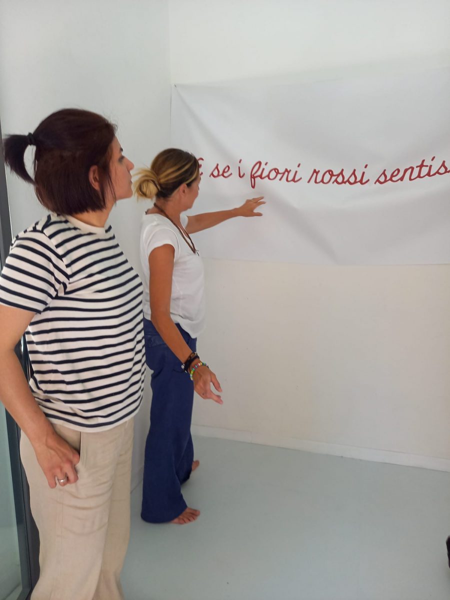 Da una parte una memoria irrisolta che risale al ventennio fascita, dall’altra il presente terribile del popolo iraniano e la sua lotta per il riconoscimento di molti diritti umani fondamentali. A partire da questi due punti sono avvenuti l’incontro e la condivisione, per arrivare all’installazione pensata specificamente per lo spazio espositivo: fiori rossi di garza a terra e sospesa una scritta a lettere rosse su stoffa bianca: “e se i fiori rossi sentissero freddo?” Una frase poetica che suona al contempo lieve e densa, e che rimanda, tra le altre, a una considerazione importante seppur spesso negletta. Perché noi tendiamo a usare i simboli senza tener conto della fragilità che sta a esatto corrispettivo della loro potenza. Prendiamo proprio il caso dei fiori. Sul ricorso che se ne fa, deve influire la coscienza, più o meno emersa, del rapporto tra l’avvenenza e la caducità: il fatto che la loro bellezza risulta persino esaltata dalla breve vita.