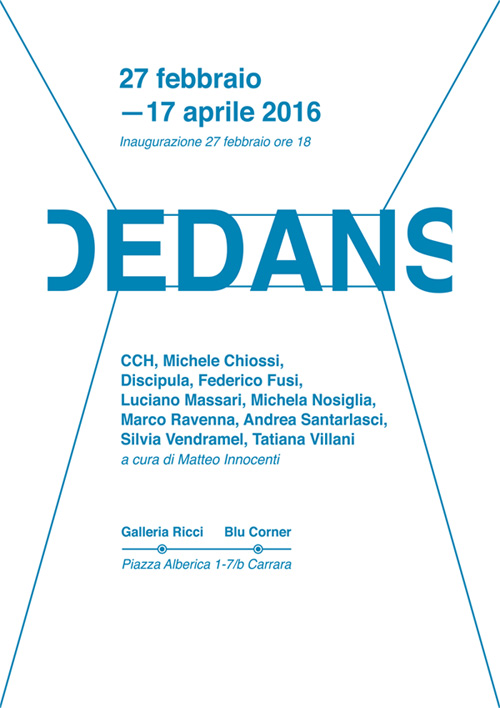 DEDANS CCH, Michele Chiossi, Discipula, Federico Fusi, Luciano Massari, Michela Nosiglia, Marco Ravenna, Andrea Santarlasci, Silvia Vendramel,Tatiana Villani a cura di Matteo Innocenti 27 febbraio – 17 aprile 2016 BLU CORNER – GALLERIA RICCI di Marialuce Ricci piazza Alberica 1 – 7/b – Carrara MS inaugurazione sabato 27 febbraio 2016, ore 18.00 Dieci artisti