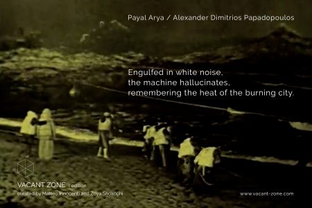 Online il progetto realizzato dagli artisti Payal Arya e Alexander Dimitrios Papadopoulos per la prima edizione del progetto di residenza artistica online Vacant Zone, dal titolo:Engulfed with noise, the machine hallucinates, remembering the heat of the burning city. A cura di Matteo Innocenti e Zoya Shokoohi. www.vacant-zone.com Il progetto di Payal Arya e Alexander Dimitrios