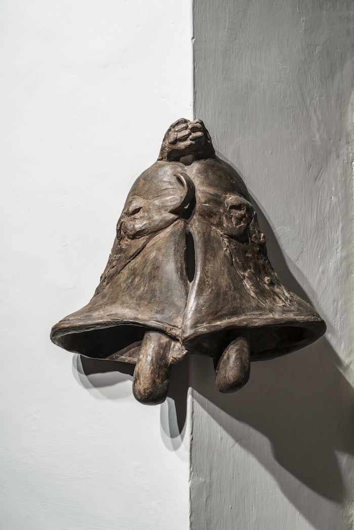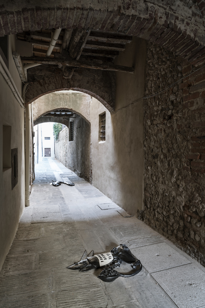 Un percorso misurato, di una decina d’opere in tutto, che si sviluppa a partire da un ascolto attento del luogo. Ne è conseguita la scelta di non sovraccaricare la nativa dimora del Masaccio, nel suo aspetto attuale già derivato da modifiche e restauri intercorsi nel tempo, e semmai di puntualizzarne alcuni aspetti tipici, strutturali. Notevole in tal senso è la scultura in bronzo di Cucchi, senza titolo ed evocativa di una campana, che come un’apparizione “sosta” all’angolo di una delle sale del primo piano. E certo le sono coerenti gli altri due bronzi a terra Sotto la coda, Nessuno e Lo Zoccolo che nella sembianza fascinante ed enigmatica – appartenenti a quanto ormai si potrebbe definire una personale mitologia dell’artista – tornano ad animare il Vicolo Rossi, chiasso la cui funzione era lo scarico delle merci fuori dai corsi principali della cittadina.