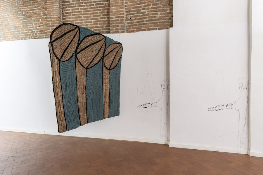 Nella scelta di opere ed interventi di Enrico David vengono interrelandosi emersione e sospensione. Le sue figure a parete definite antieroi, riportate da una matrice di carta in cui erano tracciate a grafite, trasmettono una sensazione di atemporalità poiché le potremmo considerare sia riaffioramenti di ricordi passati sia presagi di un avvenire futuro. Gli arazzi di lane intrecciate e cucite su tela stanno sospesi sopra il pavimento, sostenuti da fili metallici e diventano così, aldilà del loro motivo decorativo, delle pareti mobili che stimolano una differente considerazione dello spazio geometrico intorno.