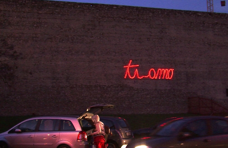 La scritta luminosa “ti amo” installata sulle mura di cinta della città di Prato, comunicava con un flipper collocato in un bar nelle vicinanze. Il flipper era collegato a un dispositivo che trasformava il suono, prodotto durante il gioco, in impulsi che a loro volta comandavano l’accensione delle luci, perciò l’andamento del gioco stabiliva la regia scenografica della scritta. Tutto di pubblico dominio ma invisibile a chi, dall’altra parte, stava giocando. L’isolamento fisico ed emotivo di un giocatore, la sua inconsapevole interazione con la scritta che vibrava nella sua intermittente accensione, come il battito delle ciglia di chi la incrocia, diveniva cuore pulsante della città, in una frenetica emozione. La prossimità particolare è la minima distanza nello spazio e nel tempo, il lì vicino e l’ora, che resterà per sempre incolmabile ed anonima nei gesti e nelle emozioni, tra chi attiva e chi fruisce.