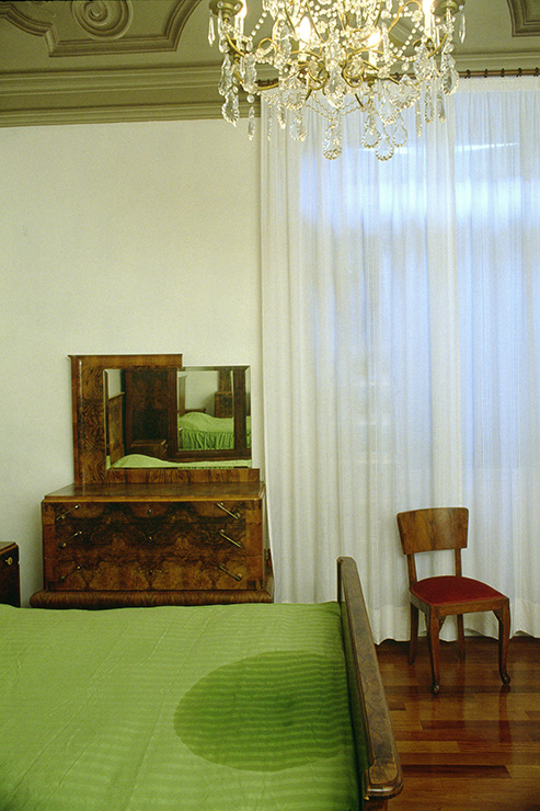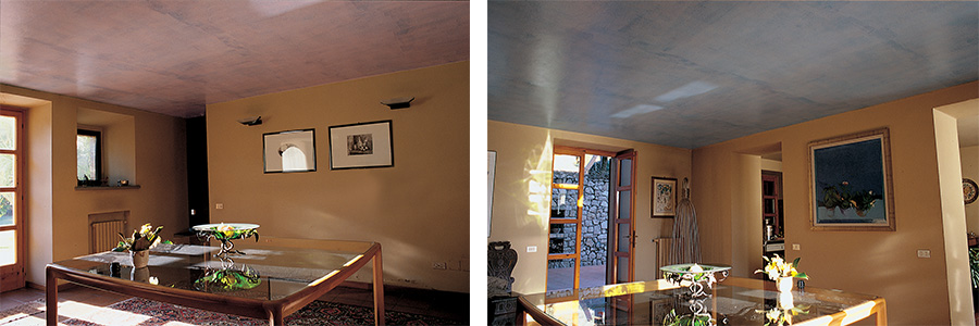 PS – Nel 1999 siamo stati invitati assieme ad altri artisti a partecipare ad una mostra dal titolo In giardino, bisognava immaginare qualcosa da collocare all’esterno. Abbiamo pensato di dipingere il soffitto del salone dell’abitazione di cobalto cloruro, un materiale sensibile che percepisce in anticipo la mutazione climatica e che quindi relaziona il dentro con il fuori.