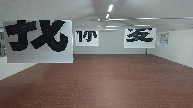 Affascinati da sempre dalla stampa xilografia abbiamo intagliato i tre ideogrammi (我愛你) che compongono la parola “ti amo”, su matrici di linoleum; attraverso la forza fisica (un salto) di coloro che quotidianamente vivono la piazza, abbiamo realizzato tre stampe di grande formato, poi affisse come manifesti – a una certa lontananza l’uno dall’altro – sui muri intorno, delimitando così un ipotetico perimetro. La seconda copia delle stampe, realizzata sempre in quella occasione e conservata da noi con cura nel nostro studio in attesa, come dici tu e come spesso accade nei nostri lavori, è stata esposta secondo una diversa declinazione nello spazio Riss(e) a Varese.