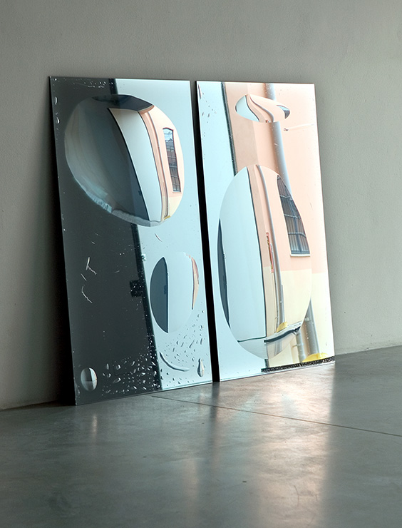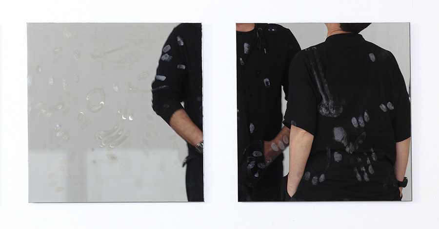 Le impronte anonime e precarie, palmi, polpastrelli, bocche, alle quali dedichiamo poco tempo, destinate ad essere rimosse con estrema facilità e scarsa attenzione, diventano protagoniste dentro lo specchio in quanto ferme e irremovibili, attraverso un trattamento di manuale specchiatura con argento, rame e successiva vernice protettiva.
