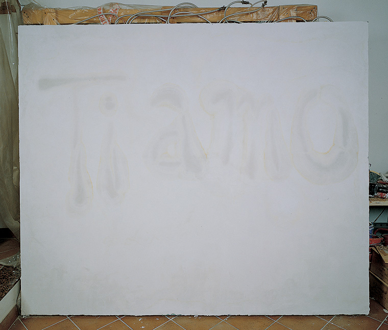 Nel “ti amo” umido la scrittura è trasudazione, un lento gemere che impregna il supporto gessoso, un’umettazione, un respiro della materia che nel tempo ammuffisce e manda cattivo odore, infastidisce la quiete domestica, attacca i muri contaminandoli.