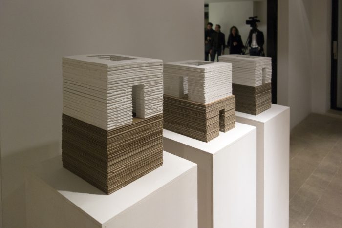 Come un nucleo cui si giunga per vari gradi, il percorso nella sua interezza è costruito tramite l’incontro con alcune delle opere e installazioni della ricerca dell’artista. Una grande Unité d’habitation nera, la cui suddivisione pittorica superficiale, evidente e materica pur nell’essenzialità dell’andamento, diviene essa stessa creazione “percepibile” dello spazio, una vibrazione che, all’atto dell’osservazione, insieme assorbe e restituisce quanto la circonda. Tre U.s.a.i.s.o (acronimo di: Uno sull’altro in senso orario): sculture di forma abitativa sovrapposte a coppie, l’inferiore in cartone e la superiore, come un calco, in gesso; lo spostamento orario di una rispetto all’altra, distinguibile per la presenza di un accesso, come una variazione dell’identico pone la questione della riproducibilità, ossia di quella successione che va dall’unico alla sua ripetizione – si tratta in questo caso sempre di una singola copia, ma è quanto basta a suggerire l’eventualità di una ri-produzione infinita.
