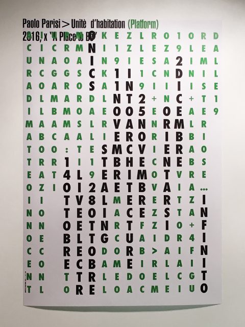 Attraversando questi estremi tra loro in relazione, riferibili all’oggettività e alla soggettività – più nello specifico: a ciò che dell’oggetto diviene mezzo di sensibilità – la ricerca di Paolo Parisi trova vie di costante approfondimento. Tale specifico, così importante perché inerente lo statuto ontologico stesso dell’arte, viene formalizzato in serie “aperte”: sia nel senso di reciproche derivazioni ed influenze, sia nel senso di interni ampliamenti e trasformazioni che, nel rispetto di un impianto basilare rigoroso, vengono derivati dal confronto con la particolarità dei luoghi e delle situazioni. Così il progetto Unité d’habitation sviluppato a partire dal 2010, nel titolo citazione diretta delle costruzioni architettonico-urbanistiche di Le Corbusier, venuto nel tempo costituendosi come modulazione continua di pittura, scultura, disegno, incisione per porre in rapporto l’ideale funzionalista – di cui si assume a emblema l’elementare scansione di linee ortogonali – con la sostanziale non funzionalità dell’arte, qui prende una forma ulteriore: piattaforma/platform di ospitalità per esperienze/eventi di condivisione. Una zona di apertura “in comune” tra l’ambiente, la propria ricerca e il rapporto con l’altro-da-sé: è proprio in tale zona che si rende possibile la trasformazione di un luogo in “luogo per essere”, secondo l’attitudine da cui scaturisce il ciclo A place to be nella sua interezza. Un manifesto-opera inedito, presente dall’ingresso, riporta la scansione di appuntamenti lungo tutto il periodo della mostra.
