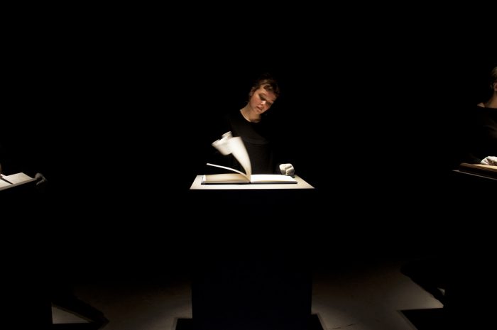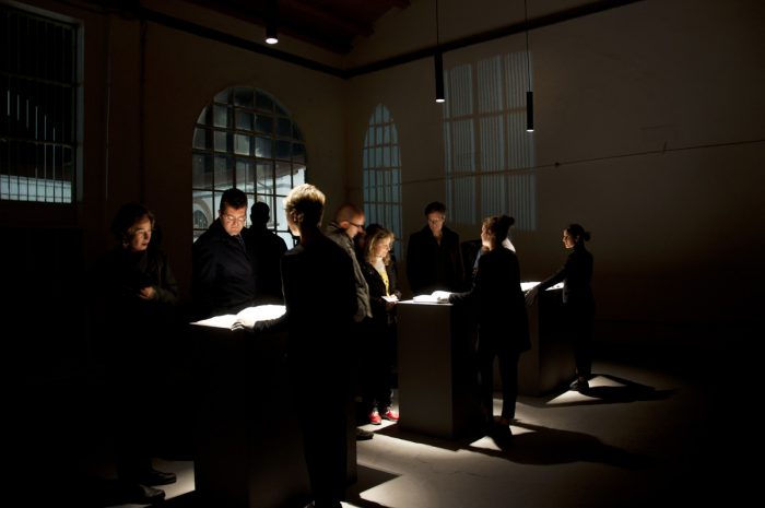 Ancora: il piano d’insieme è esso stesso opera, per l’individuazione di particolari condizioni di lettura generate dalla scansione paratattica dello spazio, dall’atmosfera dell’ambiente declinata alla concentrazione, dalla messa in relazione tra la presenza umana (tre ragazze nelle zone di lettura) e la presenza libro. Elementi a partire da cui possano scaturire, da stimolo a stimolo, narrazioni uniche e originali per ogni osservatore.