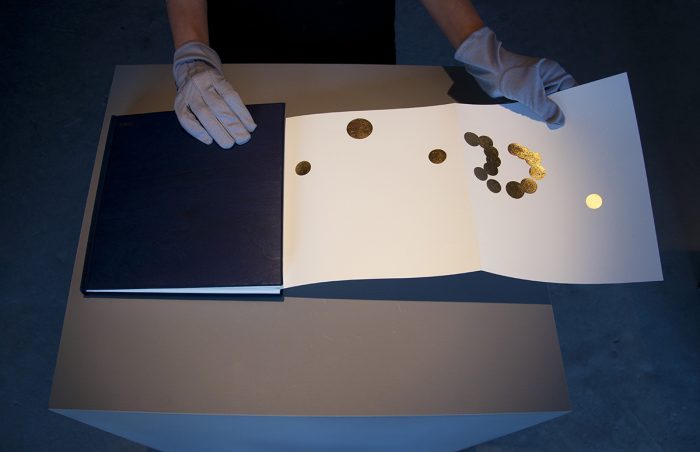 foglia oro e stampa caratteri mobili su carta di cotone Fabriano, coperta in tela e legno di betulla finlandese dipinto.