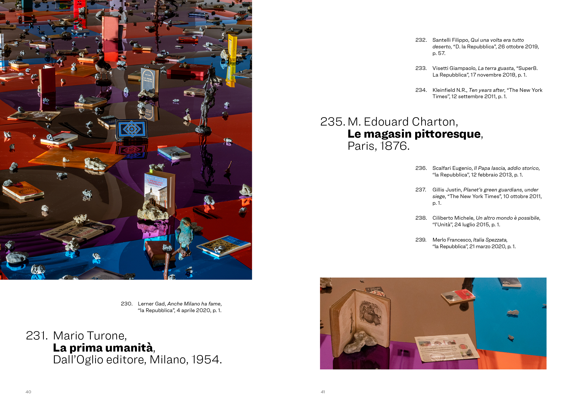 La storia dell’essere umano, la conoscenza del mondo animale e di quello naturale, le utopie e le distopie, le particelle elementari e il cosmo, trovano il loro spazio e rapporto con gli altri, come ogni stella che conforma una galassia in cui l’equilibrio tra le reciproche forze di gravità definisce la loro posizione precisa. Una contronarrazione che invita a riflettere sul rapporto che ognuno di noi ha con l’ordine attuale del mondo, interrogandosi per capire dove l’umanità, lungo la sua storia, ha preso la strada che ha deciso di imboccare. Nella selezione e nella disposizione di 7 uccelli tassidermizzati, 1 fungo immortale, 11 sculture antropomorfiche, 4 rappresentazioni di animali in bronzo, 1547 pietre somiglianti a meteoriti, 1 farfalla, 5 oggetti fatti a mano, 3 insetti e 310 testi, divisi tra libri e giornali, appoggiati su un pavimento specchiante colorato ispirato alla visione tetracromatica degli uccelli, nulla è fortuito. Un archivio immaginario è composto arbitrariamente da una serie di ritrovamenti più o meno casuali che inglobano materiali eterogenei che vengono disseminati in un determinato contesto e accostati secondo una personale rielaborazione. In questo difficile confine, si inserisce la mostra di Enrico Vezzi per gli spazi della Tenuta Dello Scompiglio a Lucca, di cui questo libro è la documentazione approfondita.