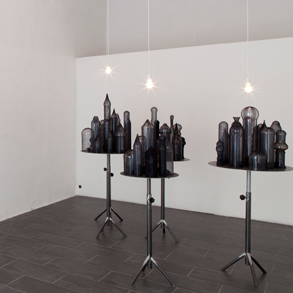 L’esercizio del lontano assume una forza caratteristica dalla sua introduzione testuale: nonostante la diversità di origine – il Libano di Elena El Asmar (Firenze, 1978) e la Calabria del curatore Pietro Gaglianò – l’esposizione si contestualizza proprio nel dialogo d’intesa tra l’artista e chi ha avuto cura del suo progetto. La chiave d’interpretazione offerta fa sì che l’installazione centrale, composta da elementi allungati di vetro in composizione di altezze e avvolti da calze nere a trama varia, trasfiguri in paesaggio collettivo. L’opera particolare si fa rappresentazione della maniera amorevole e delicata con cui ognuno di noi interviene, intessendo nel tempo poesie e mitologie, sul proprio passato. Analogamente per le calcografie che, insieme agli acrilici su tela, sviluppano il percorso; seguendo la pratica comune dell’impressione su carta di alcune “cose” – qui si tratta di centrini e di ricami recuperati, più il successivo intervento a inchiostro – i disegni risultanti evocano i processi di deposito della memoria. Senza eccessi né rischi, entro una dimensione intimista, l’effetto complessivo è di reale coinvolgimento.