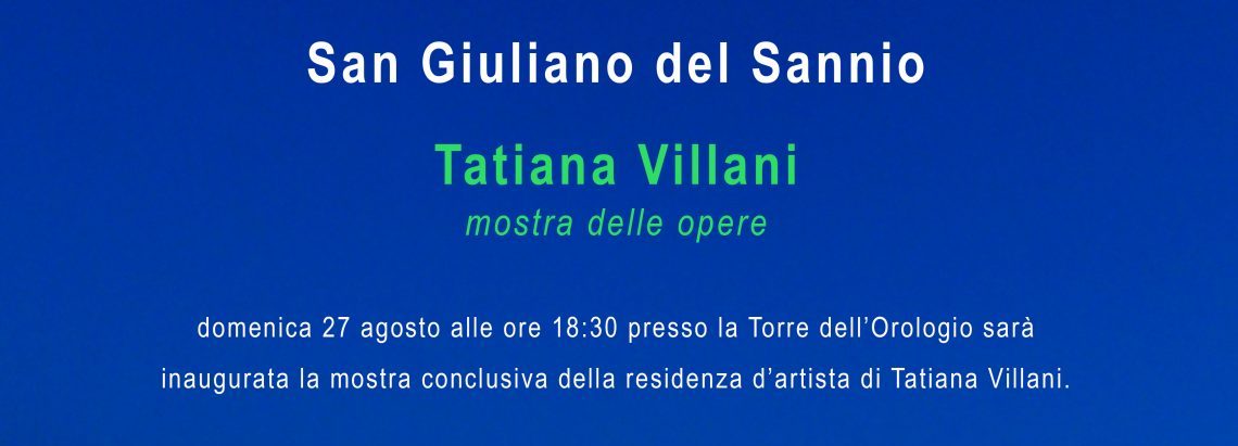 Vis à Vis – Fuoriluogo 20 Artists in Residence Project San Giuliano del Sannio (CB) Torre dell’Orologio Tatiana Villani Domenica 27 agosto alle ore 18,30 presso la Torre dell’Orologio a San Giuliano del Sannio l’inaugurazione della mostra conclusiva delle opere realizzate dall’artista in residenza Tatiana Villani. I lavori sono il risultato di circa un mese
