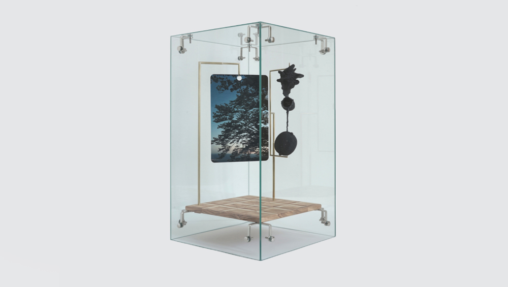 In Pratomagno(2018) sono sintetizzate l’artigianalità del fare scultoreo, che interviene per dar forma e decorare il legno d’ulivo, e l’innovazione tecnologica rappresentata dal cristallo di un iPad, dove la foresta toscana si rispecchia. Si tratta di due estetiche diverse per origine e temporalità, ma intrecciate in una struttura ideata dall’artista che le unisce e consacra, con rimandi alle antiche reliquie o teche museali, scrigni di storie millenarie.