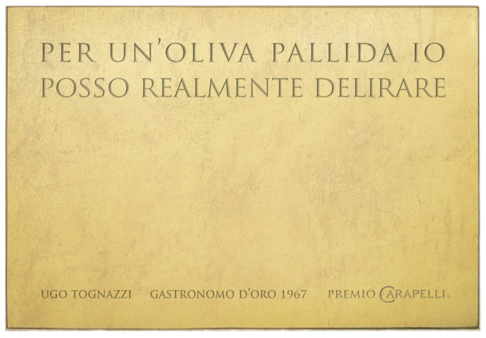 Per un’oliva pallida io posso realmente delirare(2018) di Marcello Spada si distingue per il carattere originale e ironico: l’artista rievoca il Premio Carapelli “Gastronomo d’Oro”, assegnato nel 1967 a Ugo Tognazzi e cita l’attore proponendo un verso dal libro L’abbuffone, satirica parafrasi di una poesia di Salvatore Quasimodo.