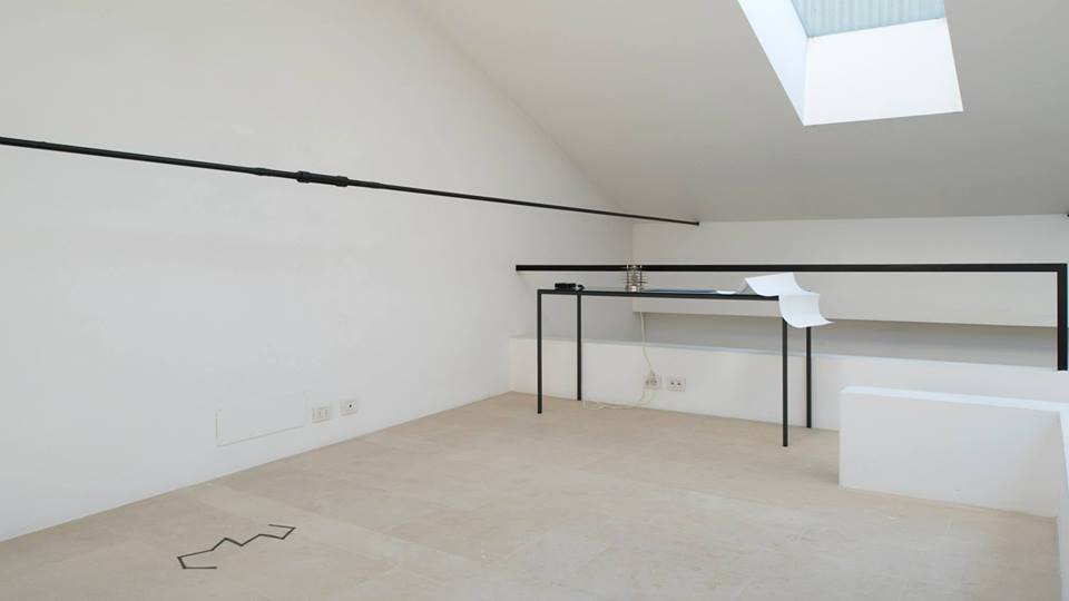 La grafite ancora, è la materia strumento per un atto di (im)possibile delimitazione. Un’altra linea di Serena Fineschi consiste in una serie di monconi quale segno minimo a livello del terreno, seguendo l’architettura, come un orizzonte disegnato o scultoreo; ed è la stessa materia che le servirà a Parigi, nell’arco di vari giorni, per tracciare una linea continua sulle pareti dello spazio espositivo, cercando di colmare la distanza che separa le due città in relazione.