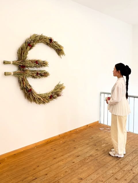 Future Primitive is a wreath of wheat and dried flowers, a reference to the prosperity of nature and rural harvest festivals. But its shape, reminiscent of the euro symbol, calls into question much more: Poland’s recent history, between its communist past and neoliberal orientation, the importance of wheat exports for the country, its membership of the European Union but not of the Economic and Monetary Union, and the growing tensions with Russia. We could say it addresses the complexity of relations between what we call the East and West of the continent.