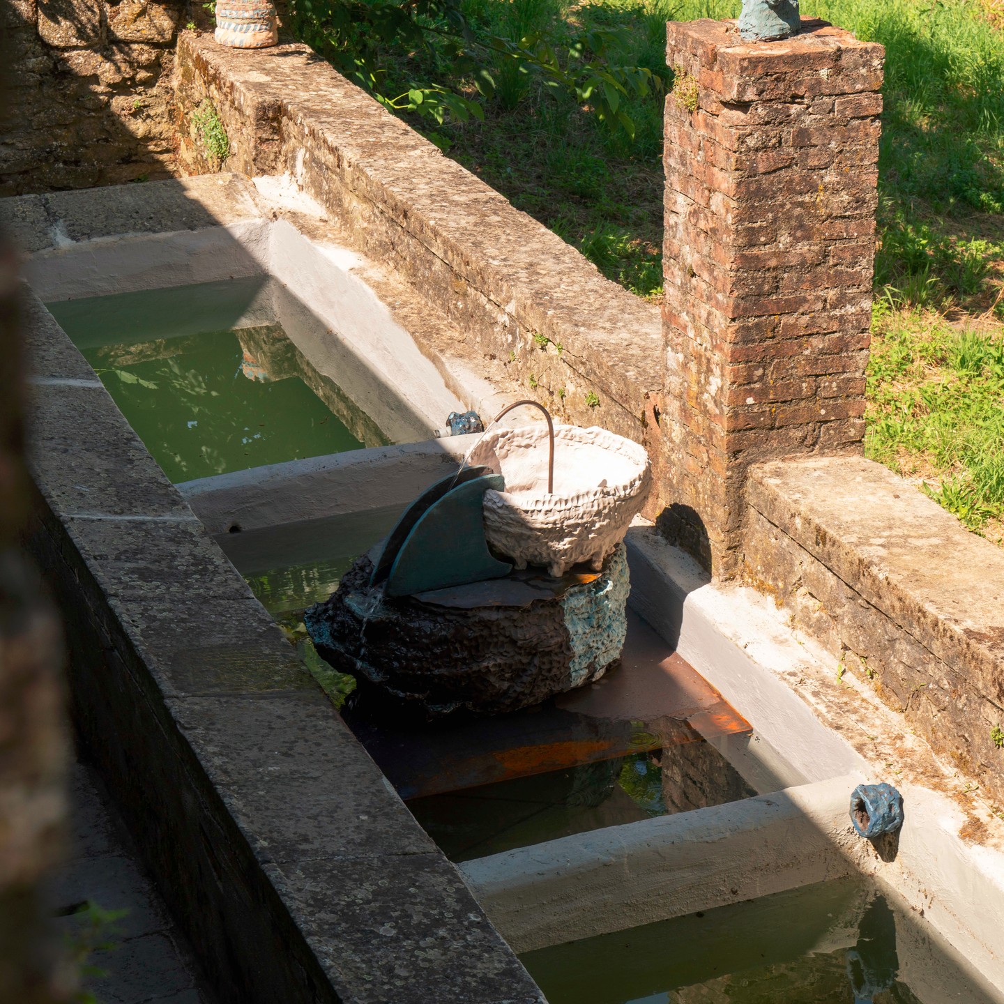 Per queste ragioni Eva Sauer ha scelto i lavatoi per la collocazione della propria opera, che è una fontana. Progettata in modo tale che l’acqua scenda da una vasca superiore a una sottostante, emettendo un suono, un mormorio che vale da evocazione di tutte le memorie che qui hanno avuto origine. Esiste infatti un’espressione nel nostro linguaggio, “la memoria dell’acqua”. Ci sono poi i “guardiani della fontana”, piccole sculture fatte dai bambini e ispirate a racconti legati al territorio. I contenitori più grandi sono il risultato del lavoro collettivo di alcune donne migranti, fuggite dalla guerra o dalla lotta quotidiana per la sopravvivenza – la decorazione di queste parti rimanda alla relazione personale con l’acqua, infatti rappresentano fiori o contenitori da cucina.