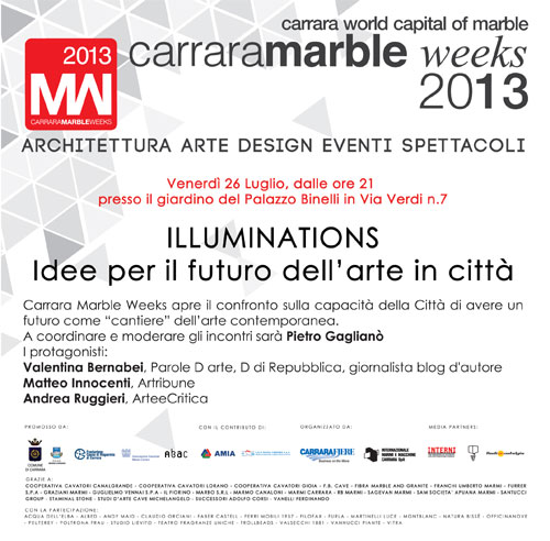 La rassegna Illuminations è promossa e sostenuta da Comune di Carrara, Camera di Commercio di Massa e Carrara, Fondazione Cassa di Risparmio Carrara, Associazione Industriali di Massa e Carrara, Accademia di Belle Arti di Carrara e organizzata da CarraraFiere e ed è stata ideata dal Prof. Luciano Massari nel contesto della sezione artistica di Carrara Marble Weeks 2013.