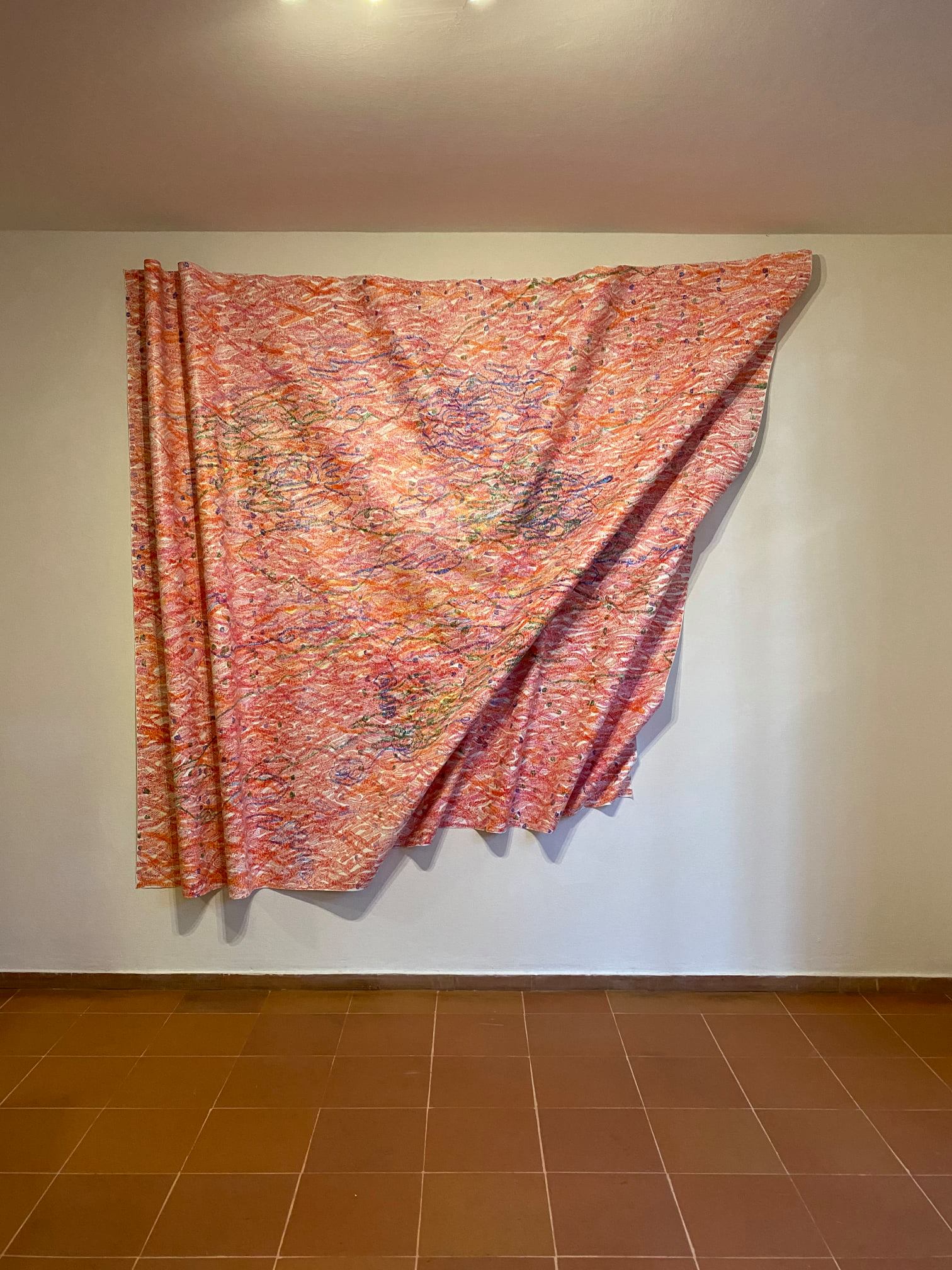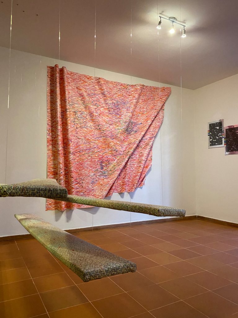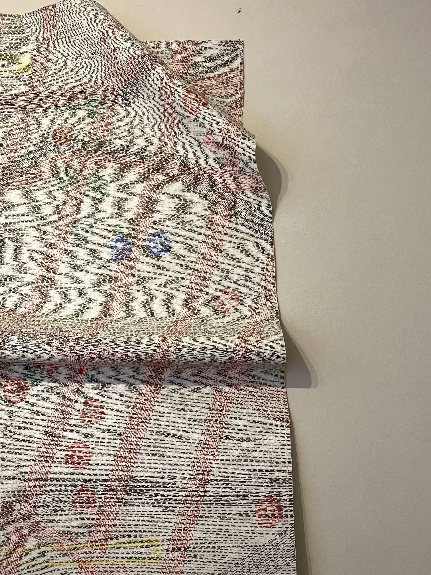 Attraverso la ripetizione ossessiva del tratteggio, ossia il segno meno dell’elettrone, l’artista elabora una serie di lavori per indagare la condizione umana. Si creano, quindi, degli intricati “tessuti sociali” all’interno delle opere e dello spazio de La Portineria, visto come luogo di confine. Proprio questa situazione di frontiera favorisce la creazione di nuove identità e storie.
