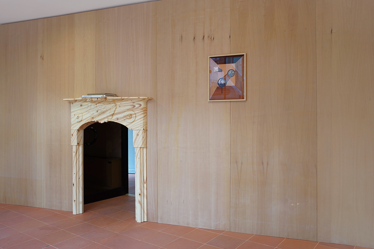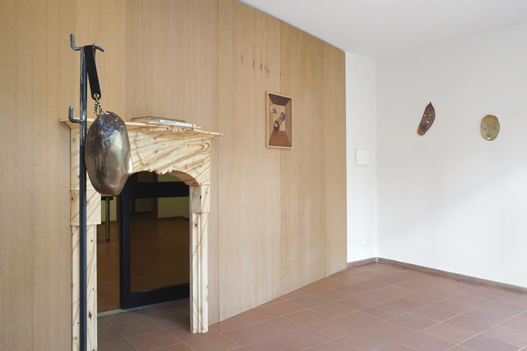 DC: Credo che alla fine il volto ritorni sempre perché lo intendo come maschera. Non a caso la parola “persona” deriva dal termine greco usato per definire la “maschera dell’attore”, nel teatro antico. Persino il caminetto, che funge da passaggio a un’altra dimensione, è mascherato. La scelta di riprodurlo in cartapesta, con effetto finto legno, riporta anch’essa al gioco del travestimento, o meglio al gioco dell’assurdo, dato che questo materiale non può andare bene per un elemento che debba contenere e alimentare il fuoco.