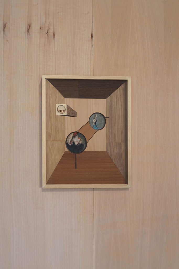 Mi sono sempre interessato a particolari autori o periodi storici, includendo o reinterpretando nei miei lavori anche opere minori o non troppo conosciute. È il caso della serie di sculture nei cui titoli riecheggiano capolavori del Rinascimento italiano, che ho replicato in maniera del tutto surreale: ad esempio Madonna Casini (detta anche del solletico) del 2017, una scultura pendula nata dalla scomposizione e stilizzazione del piccolo dipinto omonimo realizzato da Masaccio nel 1426. Tra i diversi elementi astratti che assemblano un paesaggio onirico, è riconoscibile una mano, frammento che riconduce l’opera all’immagine di partenza.