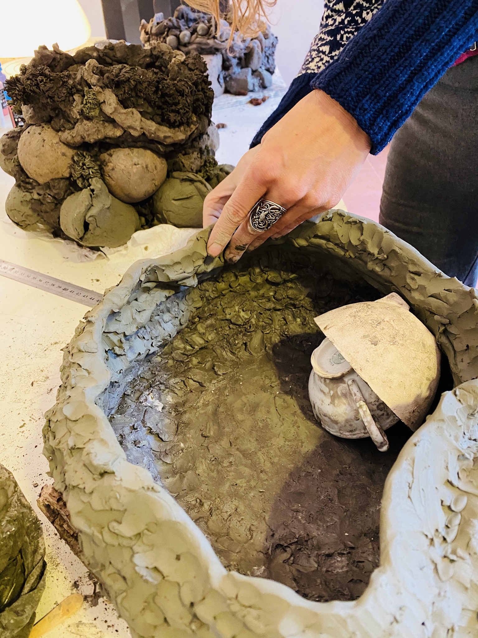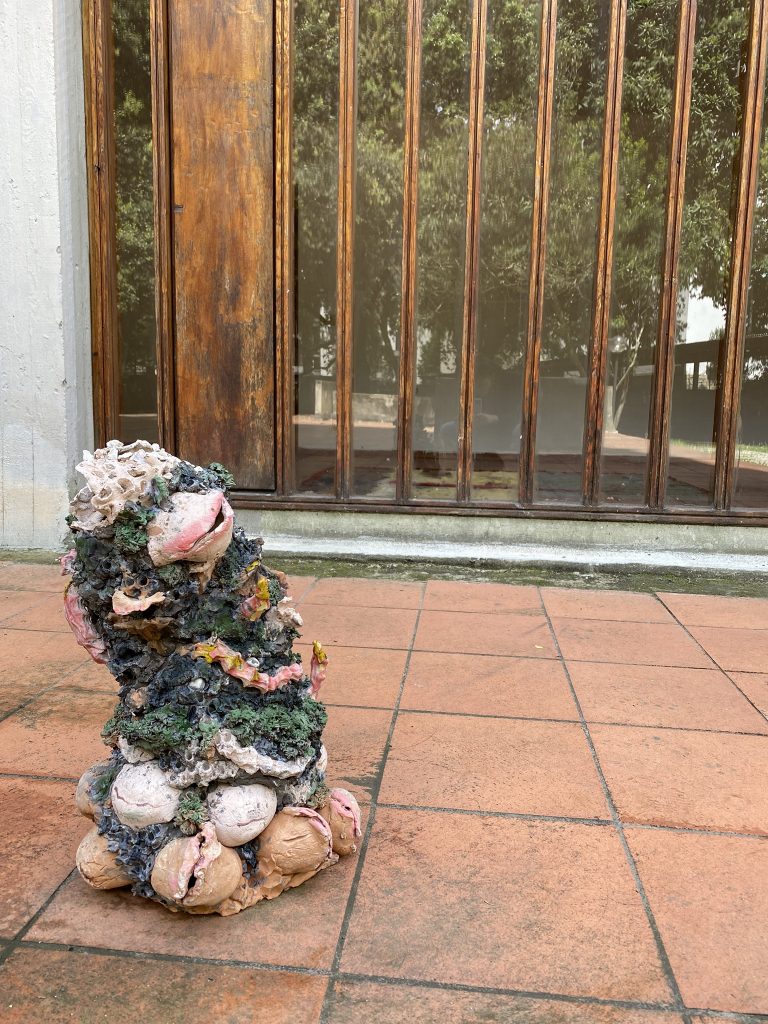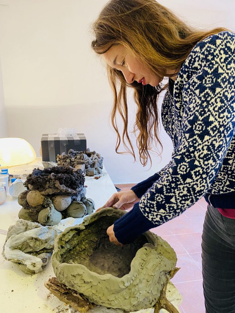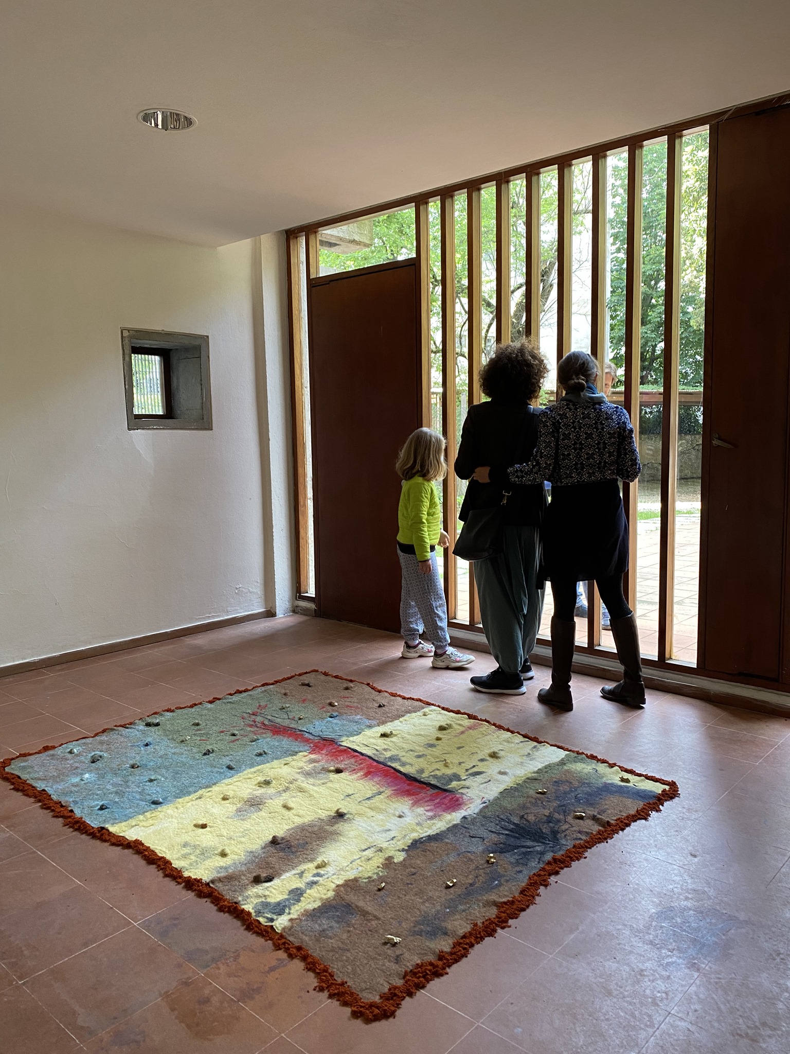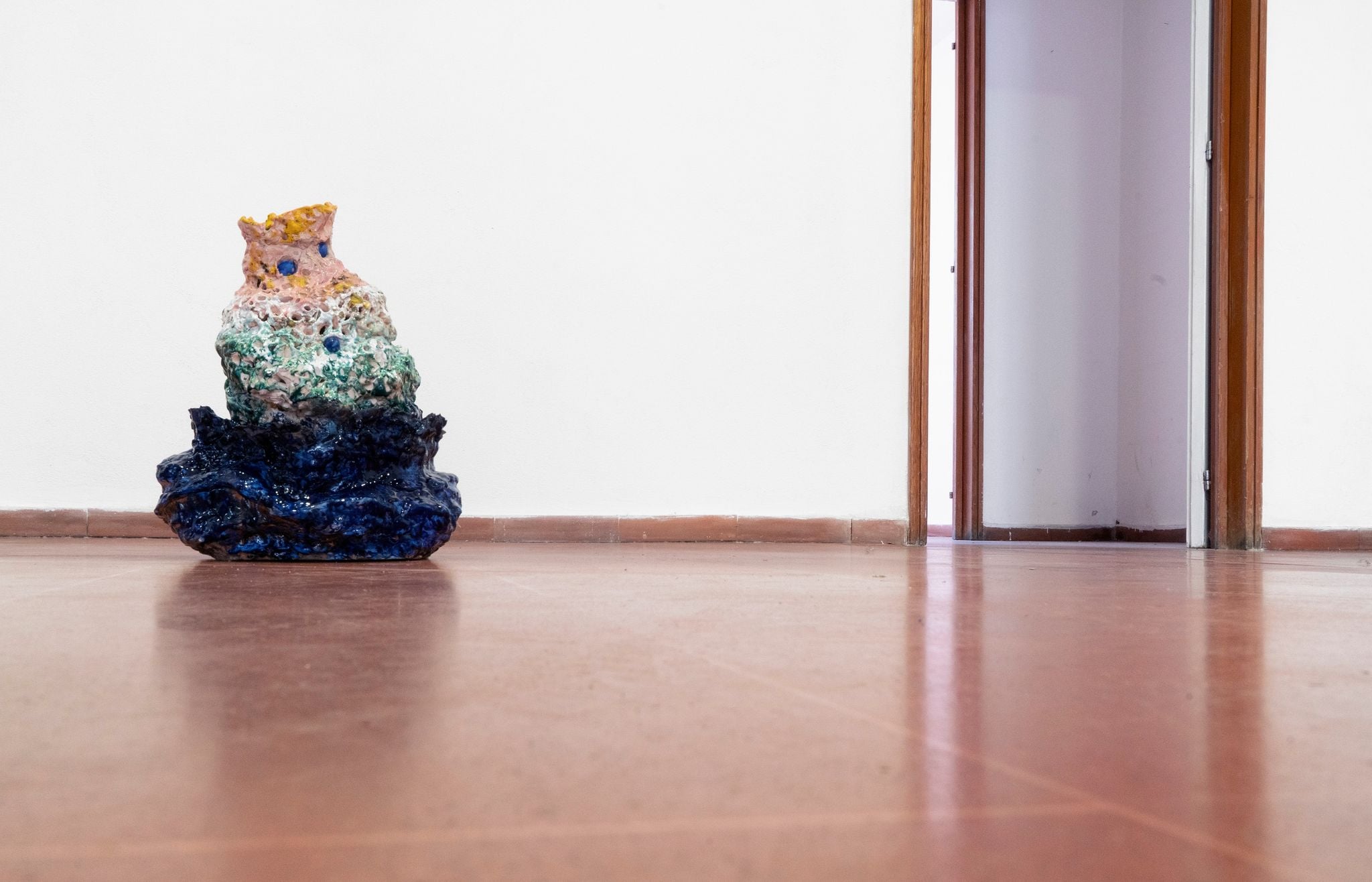 Attraverso la realizzazione di un tappeto in feltro con piccole ceramiche incastonate al suo interno e la creazione di tre diverse ceramiche-sculture, Eva Sauer ha raccontato storie di colonizzazione tossica in Africa.
